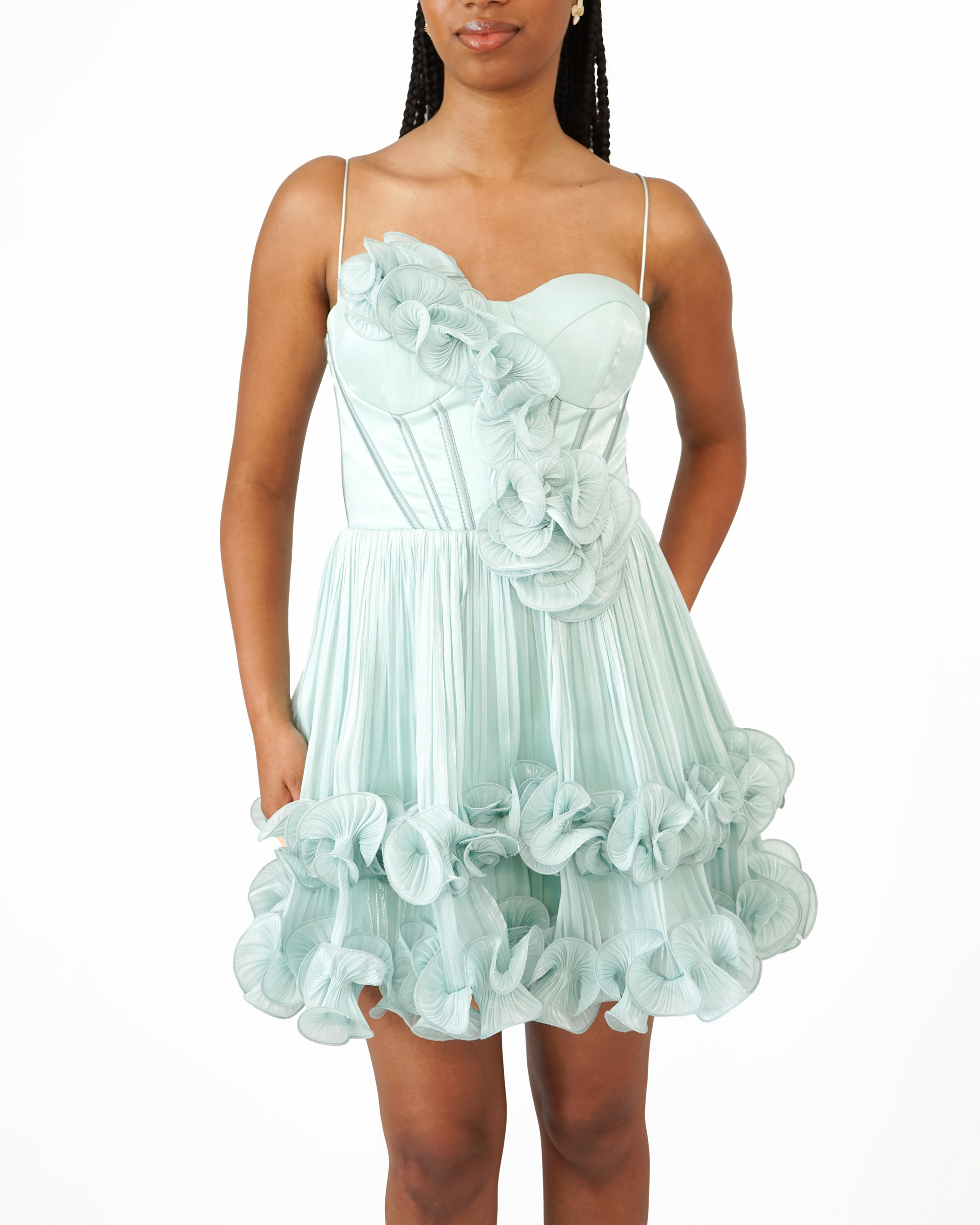 Légère et aérienne, cette robe courte en organza fluide incarne la délicatesse avec une touche de modernité. Dans une douce teinte vert d'eau, elle séduit par sa coupe bustier avec les détails plissés de fleurs en 3D, apportant a cette robe une note féminine et élégante.