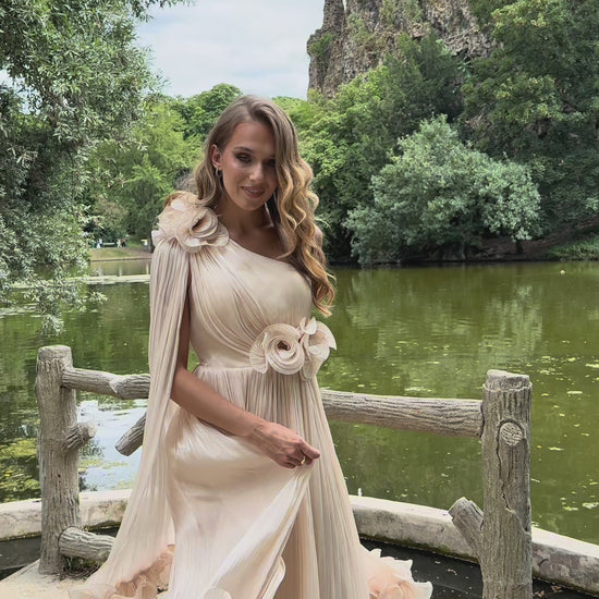 Légère et aérienne, cette robe en mousseline de soie fluide incarne la délicatesse avec une touche de modernité. Dans une douce teinte champagne, elle séduit par sa coupe bustier asymétrique qui est rehaussé de fleurs en relief, apportant une note féminine et sophistiquée.
