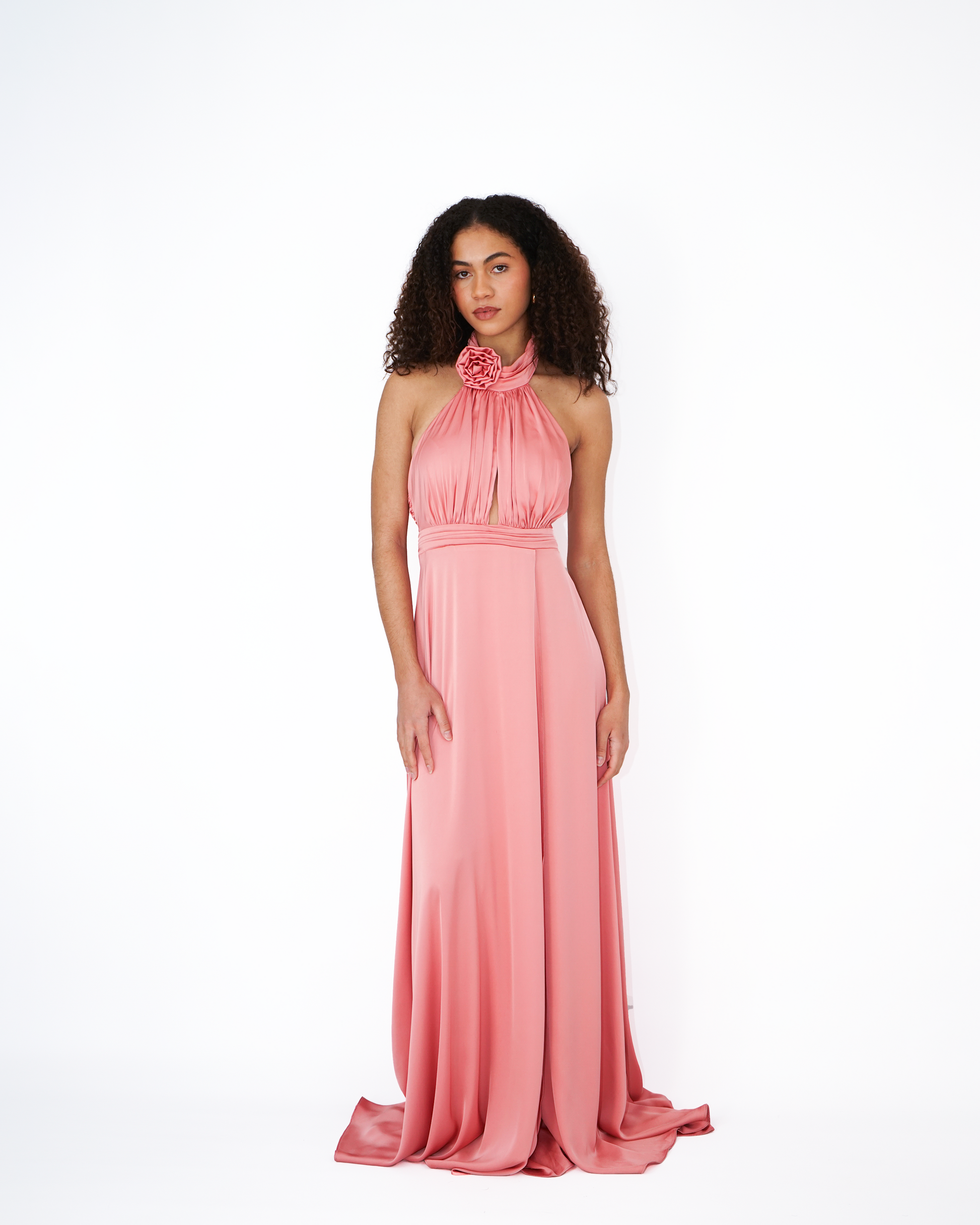 La couleur douce et féminine de cette longue robe satinée rose corail lui apporte une touche de romantisme et d'élégance.