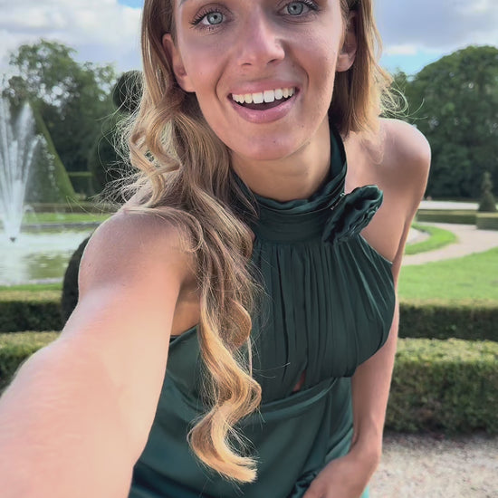 Cette longue robe dos-nu se distingue par son drapé harmonieux, qui épouse naturellement les courbes et offre un tombé fluide et gracieux.