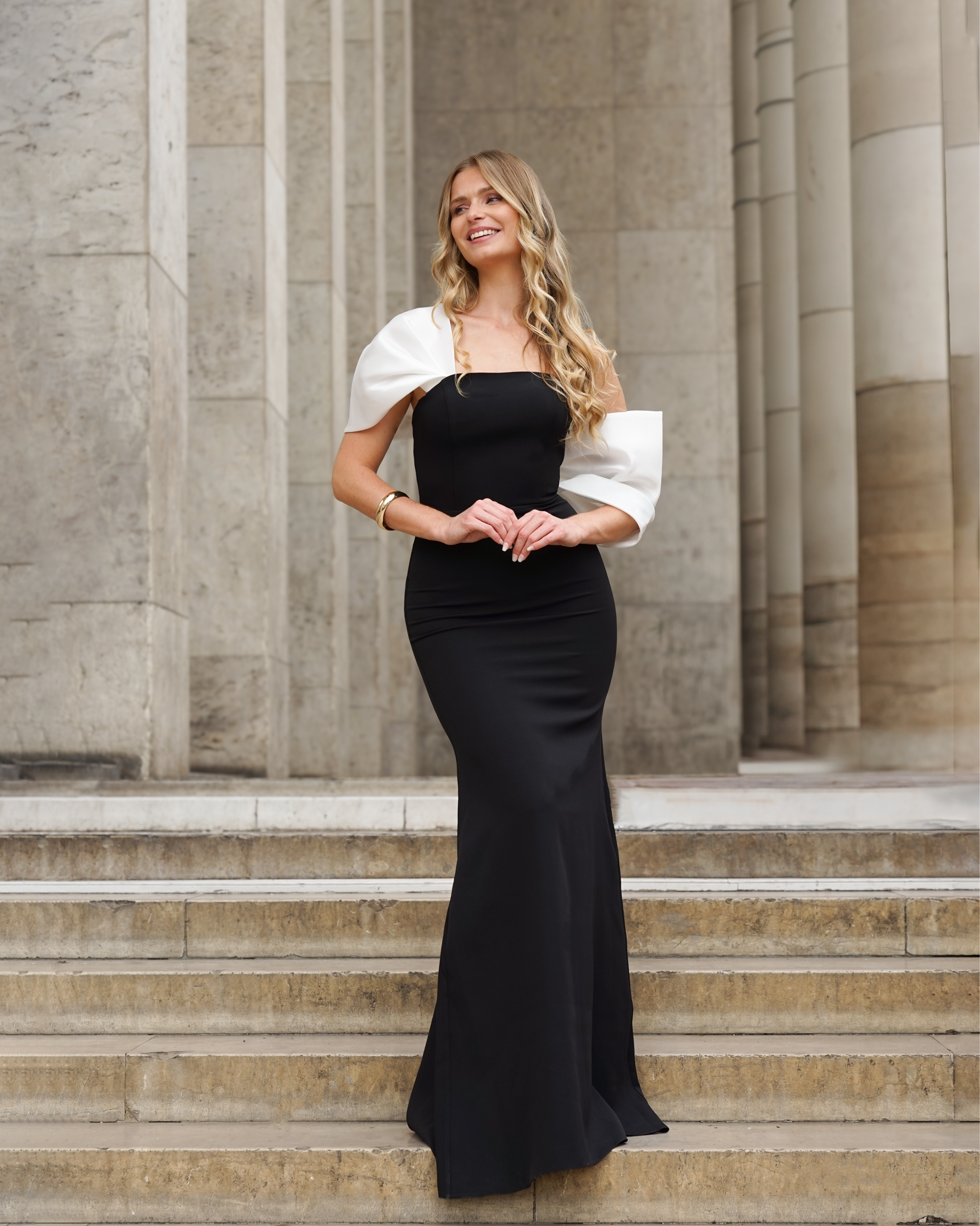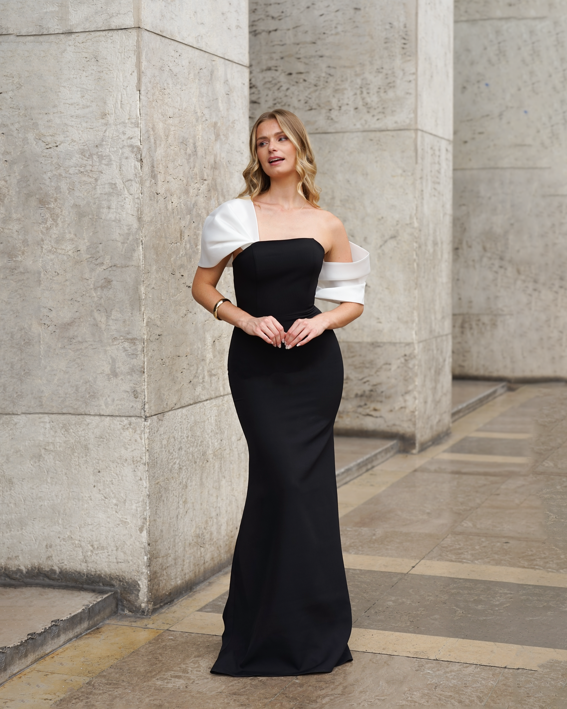 Sublimez vos soirées avec cette robe de gala noire ultra féminine, rehaussée d’un somptueux nœud en satin blanc. Son design sculptural allie modernité et sophistication avec une silhouette près du corps qui épouse les formes, et une structure bustier qui assure un maintien parfait.
