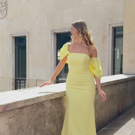 Le jaune éclatant attire immédiatement le regard, tandis que le grand nœud apporte une touche couture audacieuse à l’arrière comme à l’avant.