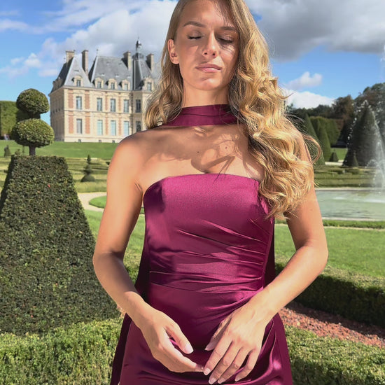 Adoptez cette robe en satin bordeaux avec écharpe pour un look chic et distingué, parfait pour briller lors de vos soirées et événements mémorables !