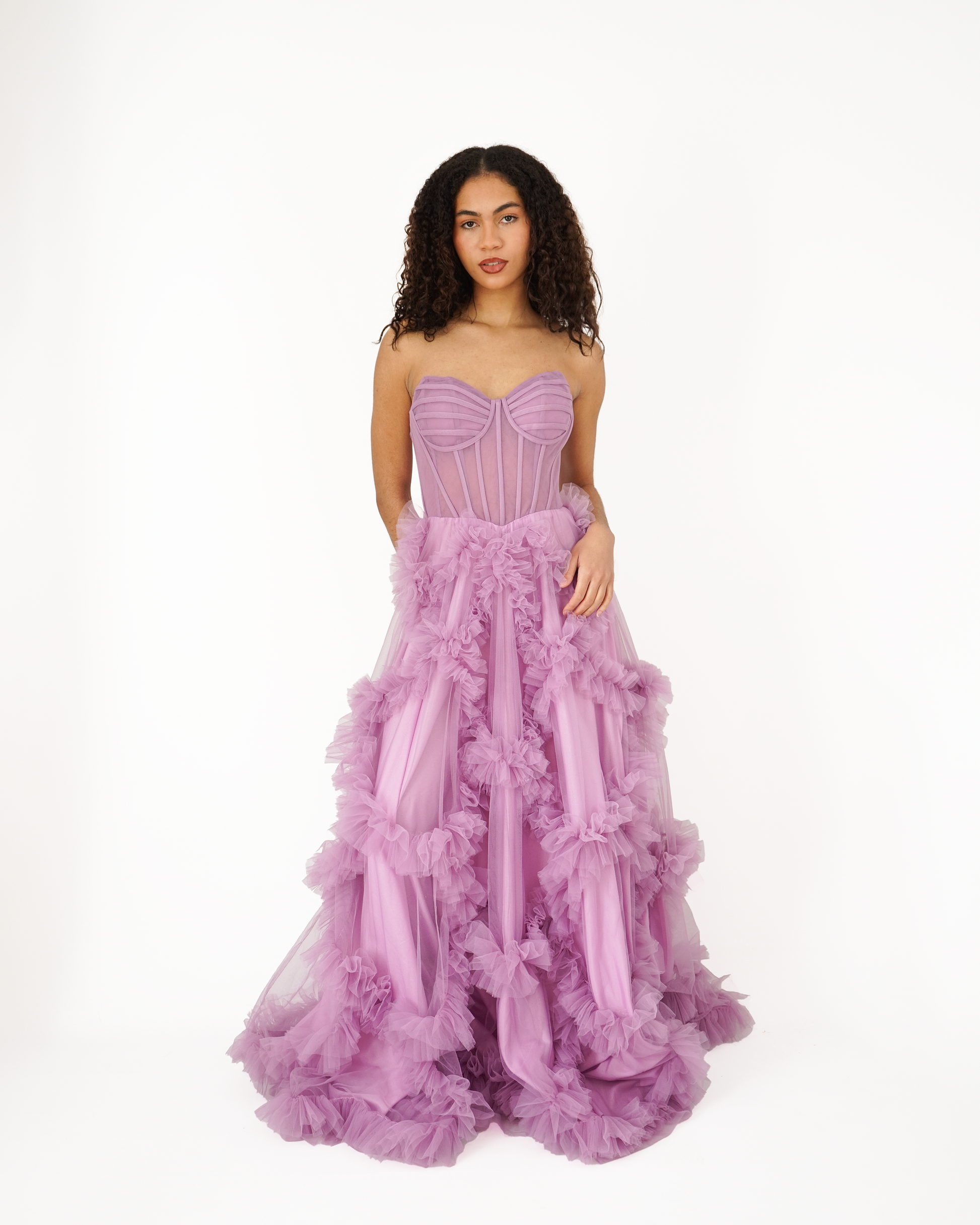 La teinte mauve donne une touche intemporelle et raffinée. Les ornements en tulle, placés avec soin sur la jupe, créent une texture unique qui capte la lumière et attire les regards. Ces détails discrets ajoutent une dimension visuelle qui complète l’ensemble de la robe.