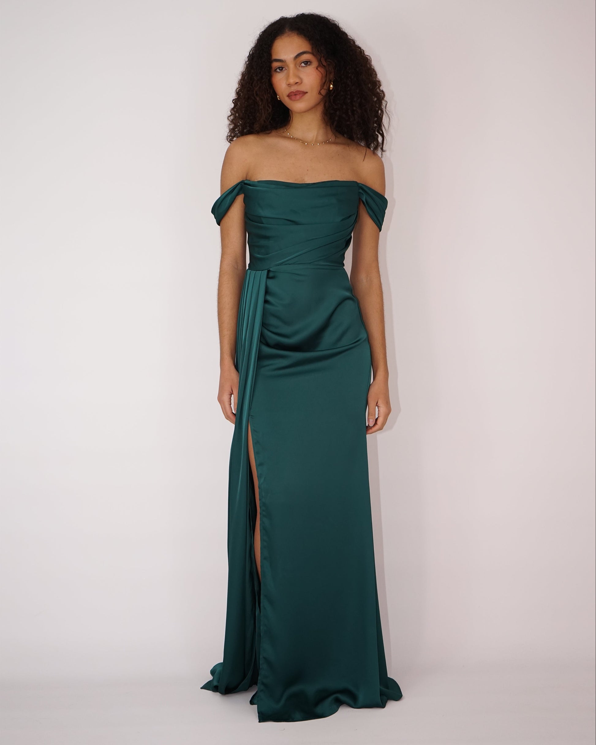 Cette robe satinée verte émeraude avec ses détails raffinés est l'option idéale pour celles qui souhaitent allier confort et élégance. Chaque mouvement crée une silhouette envoûtante, parfaite pour briller lors de vos événements les plus chics.