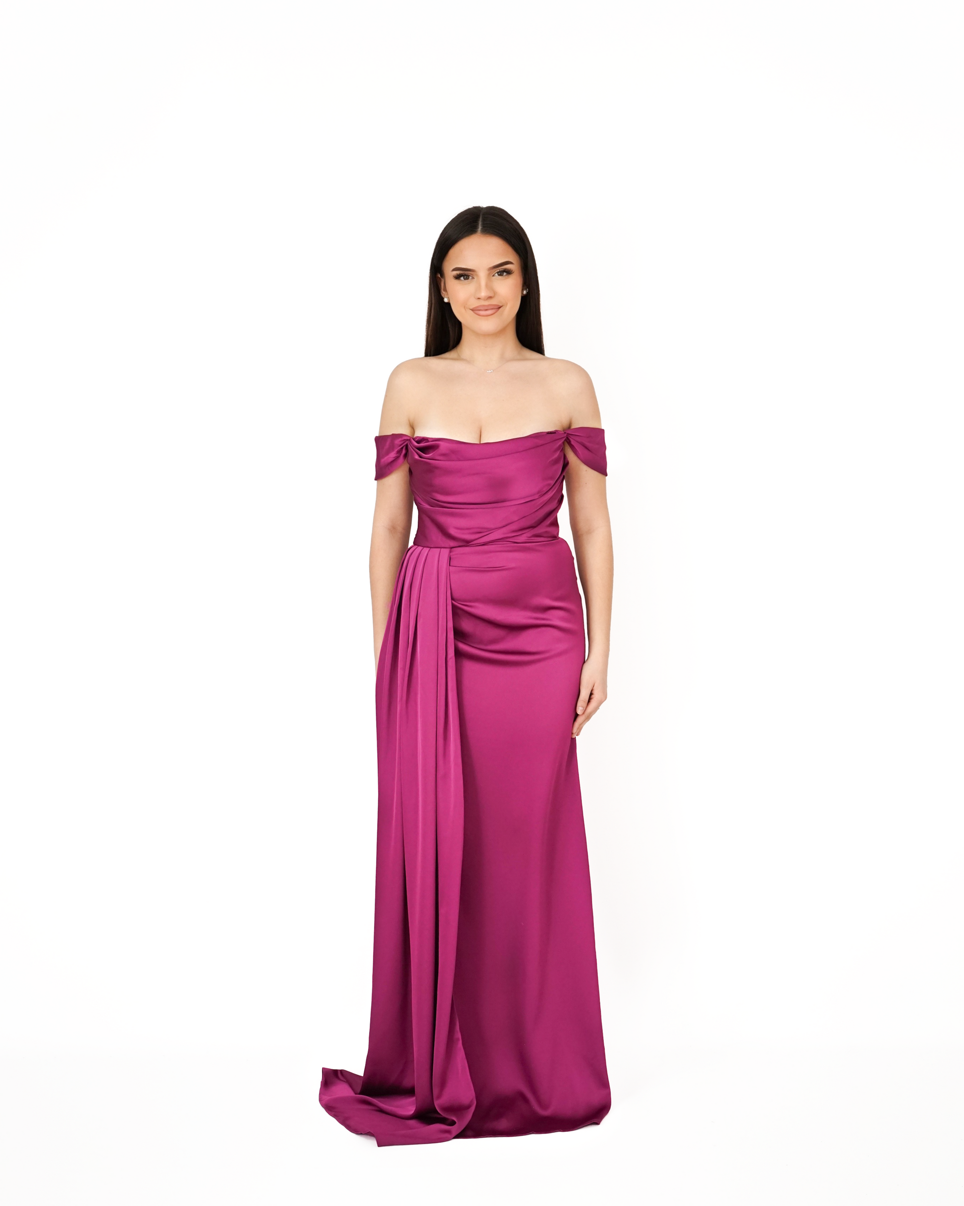 Les manches tombantes délicatement drapées sur les épaules ajoutent une touche de sophistication et un côté romantique, tout en mettant en valeur la silhouette avec légèreté. Le drapé avant de la robe, qui descend en cascade, confère un effet fluide et gracieux à chaque mouvement.
