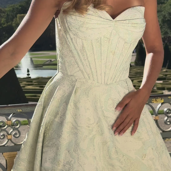 La jupe longue, légèrement évasée, est taillée dans un tissu brodé texturé vert sauge, aux reflets subtils qui capturent la lumière dorée. Elle danse au rythme de vos mouvements avec une grâce aérienne, et vous enveloppe d’une aura douce et lumineuse. Chaque détail de cette création évoque la délicatesse, la pureté, et le style intemporel.